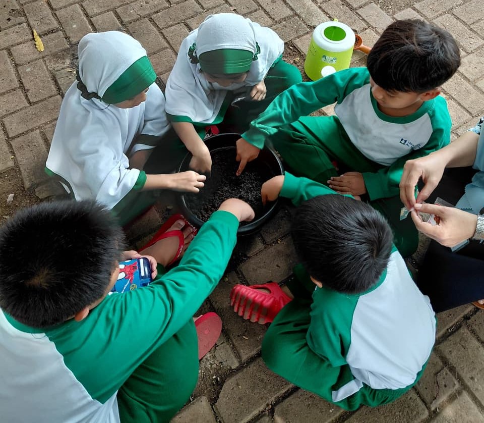 Kemudian saat yang ditunggu-tunggu tiba. Kami beranjak ke halaman depan sekolah untuk menanam bibit cabai dan terong secara berkelompok. Tema lingkungan hijau benar-benar terasa. Saya membagi anak-anak ke dalam kelompok lima atau enam orang, masing-masing memegang pot, media tanam, bibit cabai atau terong, dan sekop kecil. Instruksi saya sederhana: “Lubangi tanah sedikit, masukkan bibit dengan hati-hati, tutup dengan tanah, lalu siram.” Anak-anak dengan antusias menggali tanah, memasukkan bibit, dan menyiram tanaman. Ada tawa ringan ketika tanah menempel di tangan mereka, atau ketika bibit miring dan butuh bantuan guru. Saya membantu mereka sambil berkata: “Bagus sekali, teman-teman! Bibitmu sudah di tanah, nanti kita siram bersama setiap hari.” Aktivitas ini tidak sekadar menanam tetapi aktivitas menanam di sekolah bertujuan untuk meningkatkan kesadaran lingkungan, keterlibatan siswa, dan kesejahteraan mereka.