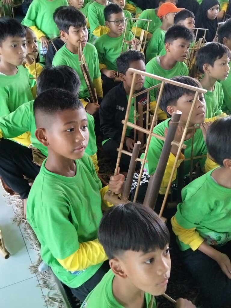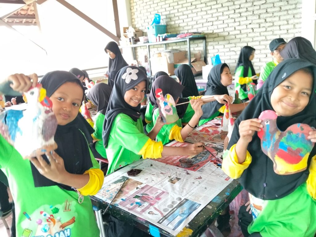 Setelah kami puas melakukan eksperimen media di PP IPTEK, lalu kami menuju ruang aula auditorium untuk segera melaksanakan solat berjamaah. Kegiatan solat selesai maka dilanjutkan untuk makan siang bersama, kami tetap tertib dalam melakukan semua kegiatan. Kegiatan berikutnya kami menuju perjalanan ke Bale Seni Barli untuk melukis celengan diatas gerabah berbentuk ayam jago, waah seru sekali ini. Kami diberi kesempatan untuk mengekspresikan warna yang kita inginkan. Teman-tema ternyata pandai semua dalam gradasi warna, jadi terlihat bagus hasil lukis cat air pada celengan ayam jago. Sambil menunggu lukisan cat air mongering, kami diarahkan untuk bermain angklung interaktif dengan menyimak not angka. Setiap anak memegang satu buah angklung yang memiliki satu not angka, Ketika tertera not angka diketuk maka secara bersamaan harus membunyikannya. Saya yang mendengar suara riuh angklung alat music Indonesia berdecak kagum. Sungguh suara yang bagus terdengar, ternyata kami bisa memainkannya dengan arahan yang secepat waktu ini. Lalu sesekali diiringi suara iringan musik modern, bahkan semua teman-temanku dapat mengikuti lirik lagu dari sebuah iringan musik.
